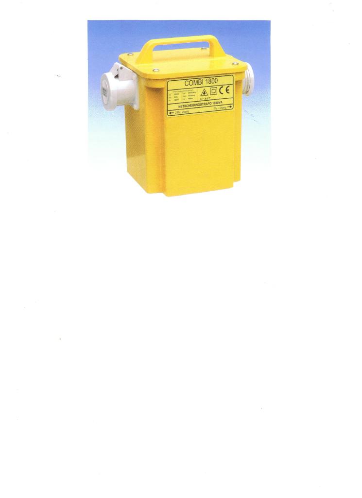 Netscheidingstransformator. Sinds januari 1996 is een ARBO-wet van kracht met betrekking tot stroomgebruik onder bijv. vloerrn en/of vochtige ruimtes. In deze wet staat, dat stroomgebruik in dit soort ruimtes, elektrische gereedschappen en/of verlichting uitsluitend aangesloten mogen worden op een betrouwbare scheidingstransformator. Daartoe hebben wij een serie netscheidingstransformatoren ontwikkeld volgens de ARBO voorschriften. Vanwege de klasse II opbouw zijn deze in alle situaties veilig inzetbaar. Combi 1800 & NS 2000/1 * uitgangsvermogen 1800 VA - 2000 VA * ingang 230 V - 230 V * uitgang 230 V/ 42 V - 230 V * beveiliging tegen OVERBELASTING * afmetingen (hxbxd) 250x200x200 mm * gewicht 18 kg U kunt de transformatoren eenvoudig combineren met boormachine, hakhamers en verlichting. Eigenschappen: - opgebouwd in Klasse II - zeer compacte slagvaste behuizing, voldoet aan IP 547 / IEC 61558 - voorzien van stevige handgreep - scheidingstrafo ontwikkeld volgens EN 60742 - uitgevoerd met thermische reset beveiliging - 5 meter lang aansluitsnoer - verkrijgbaar met dubbele uitgang (combi 230V/42V) en enkele uitgang (230V)